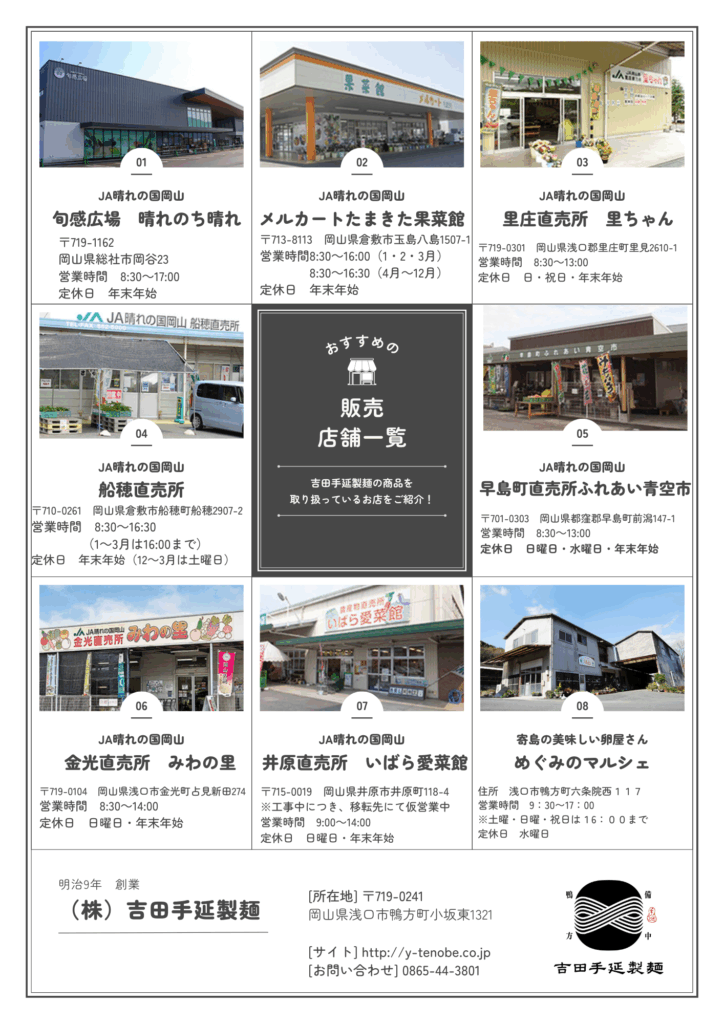 岡山県浅口市に拠点を置く「株式会社吉田手延製麺」。創業から受け継がれる伝統の技でつくら手延べ麺は、地元はもちろん、全国にファンを持つ逸品です。そんなこだわりの麺を直接手に取って購入できるお店を、浅口市を中心にいくつかご紹介します。